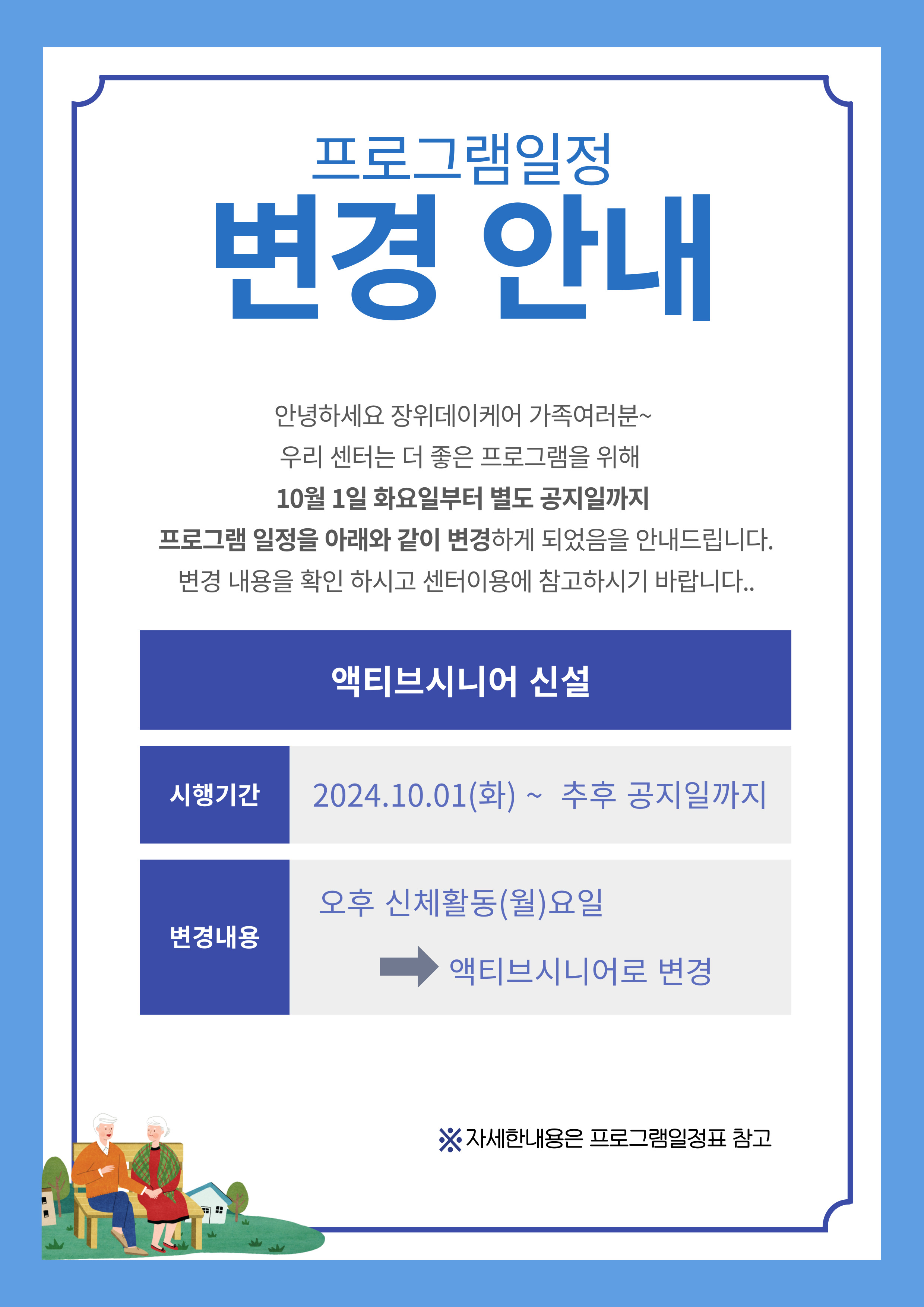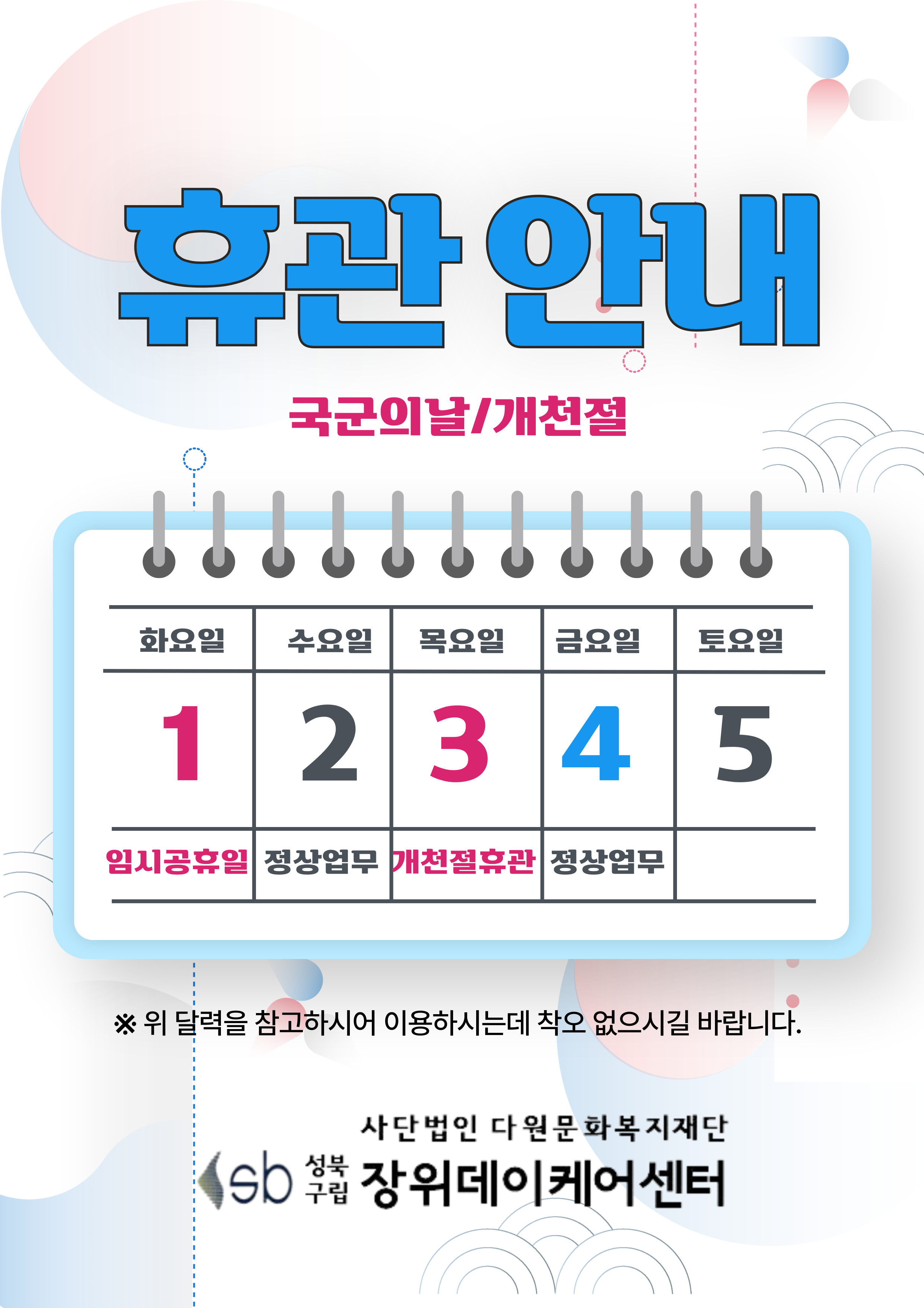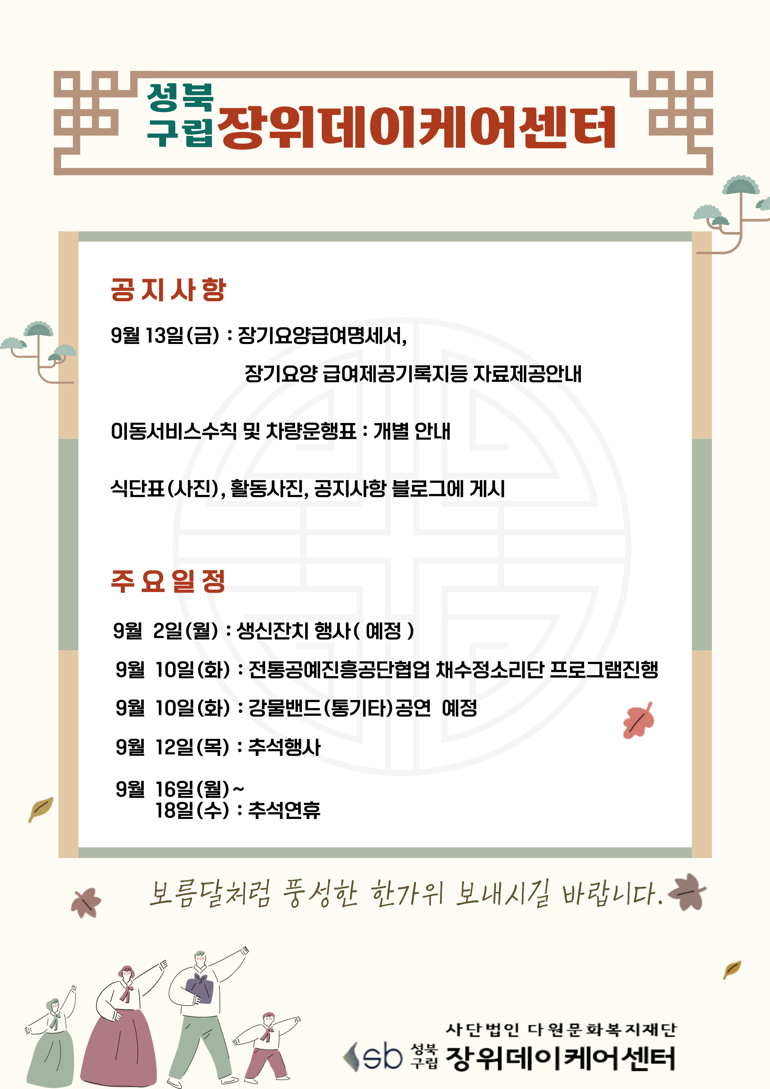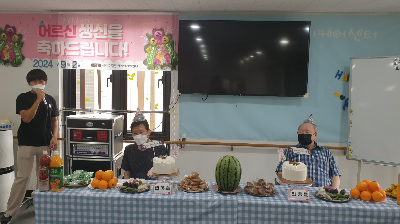 안녕하세요~성북구립 장위데이케어센터 가족 여러분~가을은 왔다는데, 여전히 더위는 가시지는 않았지만,아침, 저녁으로 선선한 바람이 부는 9월입니다.우리 센터에서는 9월 생신이신 어르신들 대상으로9월 2일 생신잔치를 진행하였습니다.이달의 생신잔치 주인공은 바로 민 O 해, 최 O 륜어르신 두 분이었습니다.먼저, 센터장의 축하 인사말씀으로 행사가 진행되었습니다.센터의 모든 종사자들과 어르신들이 한마음 한뜻으로 생신축하 노래를 불러드렸습니다.또한, 생신이신 어르신의 감사 인사말씀과 생신을 축하해 주시는 축하 덕담으로 더욱 훈훈한 생신잔치가 되는 시간이었습니다.생신이신 어르신들과 더욱 돈독해 질 수 있는 시간!!생신어르신 관련 퀴즈 맞추기~우리 어르신들께서 늘 그렇듯이 적극적으로 참여해 주시고,즐거운 시간을 보..